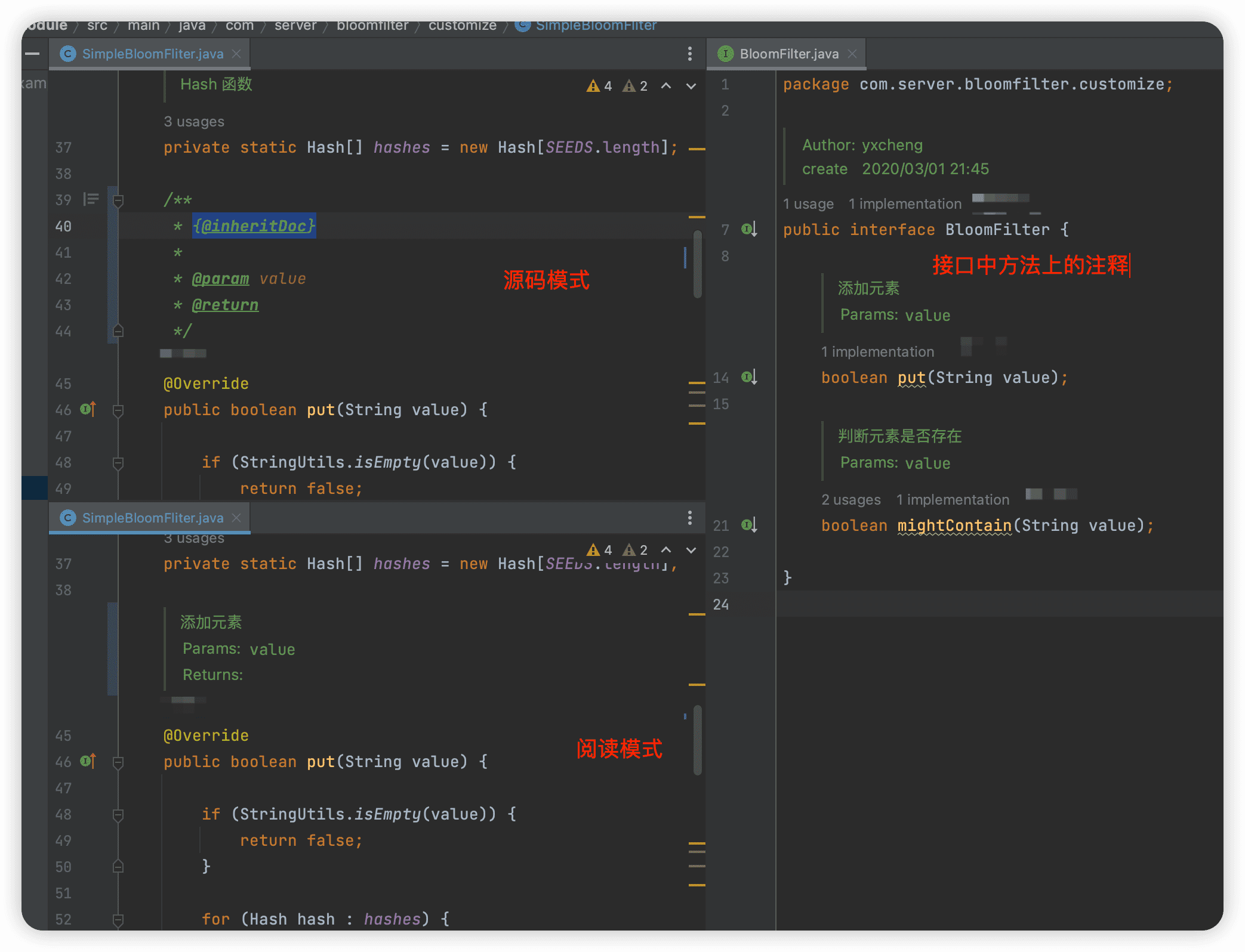 接口的实现类,使用{@inheritDoc}注解,在阅读模式下,显示接口方法中的注释。